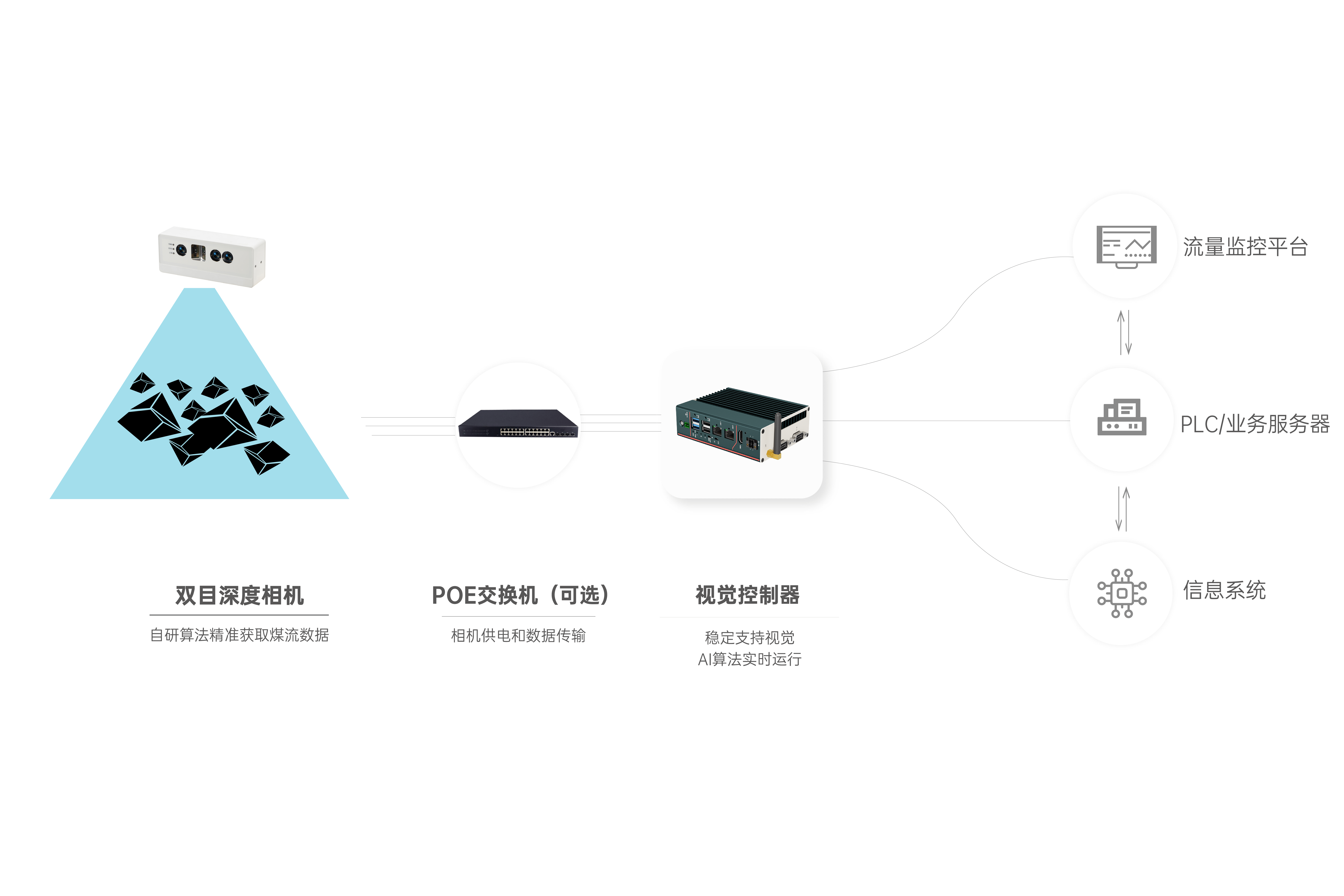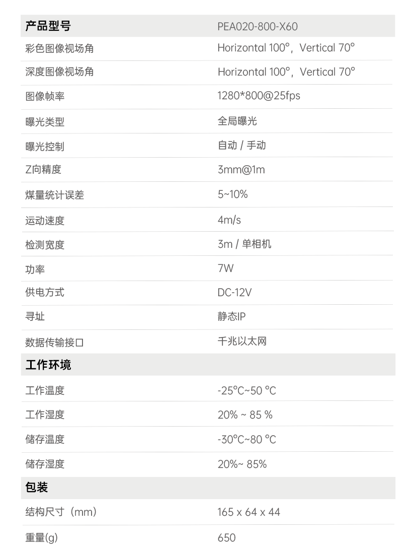 首页 动态 场景应用丨bevictor伟德智能智能煤流监测系统全新升级,赋能自动化煤流管控 场景应用丨bevictor伟德智能智能煤流监测系统全新升级,赋能自动化煤流管控 场景应用 2024-07-08 浏览量:2242 煤矿行业中,生产安全和节能降耗是两大痛点问题,在实际运煤过程中,跑偏、摩擦生热、堆煤、皮带撕裂等故障常造成重大安全事故,运输轻载和空载仍匀速运行会出现“以小拉大、无效运转”,导致能源大量浪费。 目前,传统测量设备智能化检测程度低,维护人员多,人力成本高,影响生产效率;皮带秤是采用较多的称重仪器,而在体积测量场景不易直接实现,而激光三维扫描测重系统价格昂贵,难以普遍使用。 如何通过提升皮带输送机采集精准数据能力,减人降耗,提高安全防范,进行自动化管控成为煤矿行业亟待解决的问题。 bevictor伟德智能智能煤流监控管理系统,基于双目立体视觉技术实现精准的数据检测和输送带控制。系统由3D相机硬件、嵌入式计算平台、流量监测平台构成,实现输送带煤量监测统计,堆煤监测、块煤监测、异物监测、跑偏监测、撕裂监测等功能,以采集的精准数据为智能调速、皮带运输安全检测等智能化改造提供助力,达到减人增效,节能降耗的目标。该系统环境环境适应强,部署简单,无需改造现场环境即可安装。 司眸®智能煤流监测管理系统应用于某煤流监测项目 产品介绍 bevictor伟德智能智能煤流监测管理系统采用自研非接触智能煤流RGBD相机,搭载输送机煤流监测智能管理平台,相机在AI算法加持下,能实时采集到高质量煤流RGBD数据,实现高速运输的煤炭皮带机进行多种智能化场景应用,易于部署,通过千兆网口直接对接PLC或服务器,安装便捷,无需改造现场环境,对环境光适应性强,不易受皮带颜色信息干扰。 系统应用功能 煤流统计 通过智能煤流RGBD相机采集动态输送机上的煤矿体积的三维数据,输出深度和彩色数据信息。该功能还可应用于输送带智能调速,生产数据管理,库存管理等智能化升级改造。 支持皮带速度:4m/s 粉煤煤量统计误差:≤5% 块煤监测 通过立体视觉技术,测量块状物的长宽数据,识别大块煤,输出高精度数据。 支持皮带速度:4m/s 异物监测 通过智能算法可识别大块矸石、铁器(锚杆、角钢)等非煤异物。 煤堆监测 在出料口、传送带上实时监测堆煤高度,实时输出堆煤结果。由此实现输送机安全监控,提前预防堆煤事故发生。 堆煤高度检测精度:毫米级 检测周期:秒级 最佳检测皮带宽度:600~2400mm 跑偏监测 根据智能相机安装位置定位皮带边缘位置,进行位置标定及设定跑偏阈值,通过获取的输送带三维尺寸位移信息,对皮带左右边缘位置与阈值比较并进行跑偏判断,输出跑偏结果。 左右皮带边缘定位精度:毫米级 检测周期:秒级 最佳检测皮带宽度:600~2400mm 智能煤流RGBD相机特点 01 高精度测量,保障数据准确 在高速动态检测上,测量精度可达毫米级,测量结果与实际煤量误差小于5%; 支持设备端断网续存,联网后相机前端与后台系统可保持数据同步。 02 适应性高,鲁棒性强,复杂场景可运行 抗强光、反光干扰:可抗强光、反光,自研算法支持煤矿等深色、黑色物体精准测量; 抗阴影干扰:在室内、地下、夜晚能稳定测量,无需补光; 多类型输送机适配:可适配平直型、U型、V型等各类型输送机; 适应于矿场粉尘、煤炭表面有水渍的情况; 结合算法对皮带输送时产生的震动进行自适应调整,减少测量误差; 针对井下场景可选用防爆硬件及井上应用工业级硬件设备,满足应用需求。 03 部署简单,安装便捷 出厂相机内参标定,可快速部署集成,无需改变现场环境即可安装,实施速度快,调试简单,系统易于维护。 04 接口丰富,数据直传 丰富的系统对接接口,可直接对接PLC、变频器、服务器,快速完成精细化皮带控制。 05 大景深、大视野,多范围应用 测量皮带宽度达2.4米; 测量煤堆高度达1.5米; 设备组合方案可支持更大视野。 05 边缘计算架构,实时测量 使用边缘计算架构,将多种智能算法在边缘端实现,保证数据实时传输。 RGBD相机参数 bevictor伟德智能深耕机器视觉领域近十年,垂直领域技术积累深厚,经过长期自主研发,现已推出系列体积测量方案,包括智能煤流监测管理系统、RGBD大货体积测量、动态包裹体积测量、静态包裹体积测量等,能够满足各领域不断增加的业务需求。 我们一直秉持以服务客户为中心,将技术与产品创新作为对客户、行业和社会应尽的责任。未来,bevictor伟德智能将坚持科技创新,始终致力于数字化转型升级及智能化发展,促进全社会生产效益提升。 上一个:场景应用丨bevictor伟德智能3D视觉+AI深度学习,助超大型货物体积测量更准,更稳,更易用 返回列表 下一个:3D机器视觉可以完成许多2D机器视觉无法完成的任务。 更多新闻推荐 端到端 更易用丨bevictor伟德®散料运输动态监测与预警系统全新上市 新品上市 2025-02-20 小尺寸 更灵活丨bevictor伟德3D相机PEA020-800-Y80S上新,助力多场景智造升级 新品上市 2024-09-29 目前主流3D视觉技术各有什么优劣势?如何选择最Match的工业3D相机? 技术科普 2024-08-12 【最全选型攻略】挑选合适的工业相机,必须提前考虑12要素! 工业相机 2024-07-16 场景应用丨bevictor伟德智能3D视觉+AI深度学习,助超大型货物体积测量更准,更稳,更易用 场景应用 2024-06-04 超高读取 极致易用丨bevictor伟德智能发布RGBD动态包裹